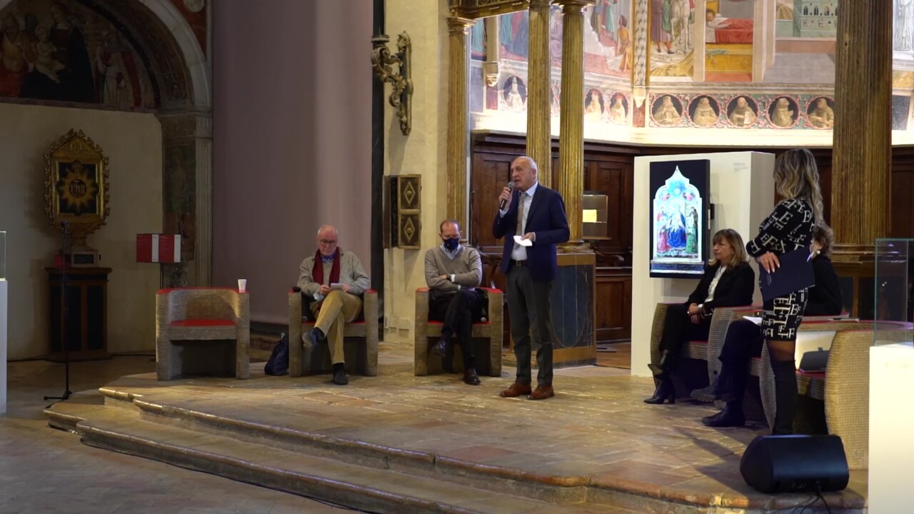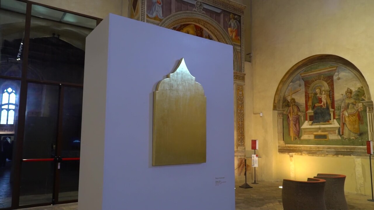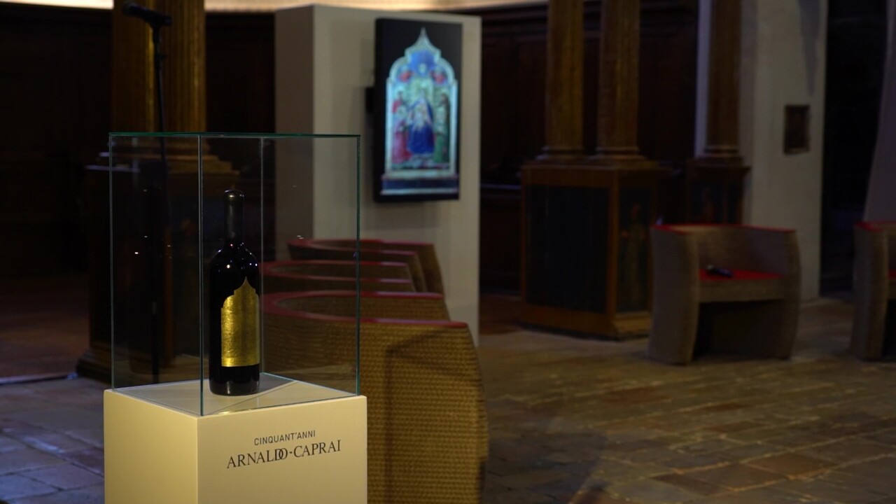 Per celebrare i suoi primi 50 anni la cantina oggi ha presentato ufficialmente un’edizione limitata di Montefalco Sagrantino Docg, con una preziosa etichetta celebrativa da collezione, in oro zecchino, firmata dall’artista Paolo Canevari e realizzata dall’antica azienda fiorentina Giusto Manenti Battiloro. La foglia d’oro che diventa etichetta per il vino dei 50 anni d’attività è l’ultimo esempio di come far interagire territorio, cultura e tradizione col vino: firmata dall’artista internazionale riveste 2.400 bottiglie ispirandosi alla tavola dello “Sposalizio mistico di Santa Caterina d’Alessandria” di Benozzo Gozzoli, datato 1466 e conservata a Terni, nel Museo d’Arte Moderna e Contemporanea “Aurelio De Felice”. Doveva arrivare al Museo Francescano di Montefalco per l’evento di oggi ma difficoltà burocratiche hanno impedito che questo accadesse. «I musei sono avari e sempre privi di prospettiva», ha commentato pubblicamente Vittorio Sgarbi, anche lui nel panel di intervenuti all’evento di oggi.  Al posto dell’opera originale, quindi, l’innovazione citata ancora da Aldo Bonomi è venuta in soccorso, consentendo la proiezione dell’opera in formato digitale.