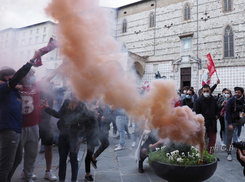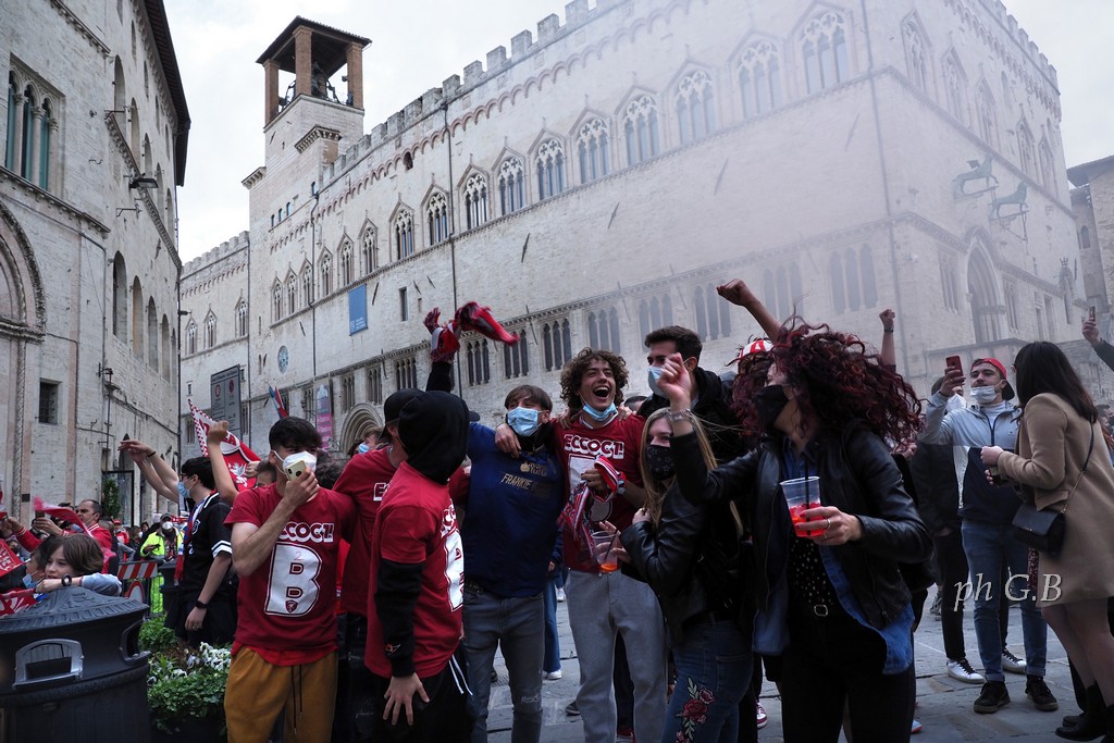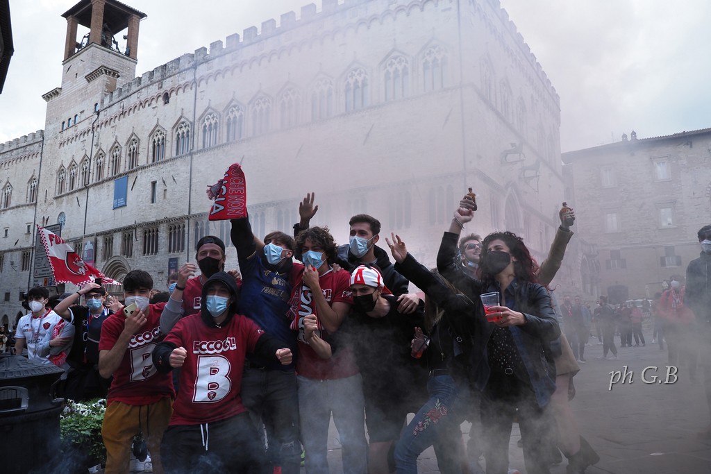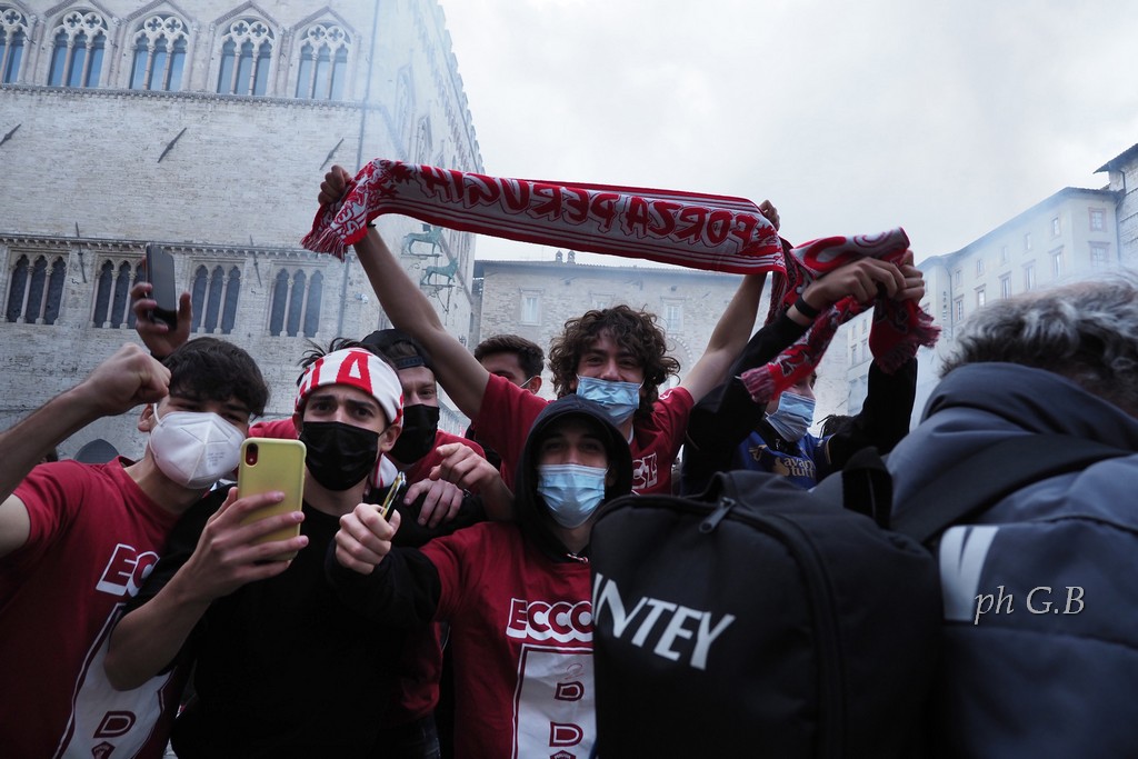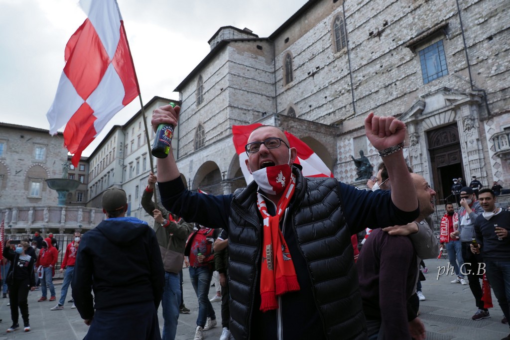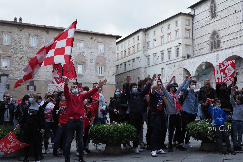 Un po’ di festa ci voleva! Se ne sentiva la mancanza! La vittoria del Perugia Calcio con la promozione in serie B, dopo un anno di assenza, ha fatto riversare tante persone in centro. Clacson di auto e moto, bandiere biancorosse, maglie, fumogeni, cori striscioni e salti di gioia in un centro che improvvisamente si è colorato di gioia e allegria. Un’ora dopo la fine della partita, con la promozione del Perugia grazie alla vittoria per 2-0 sul campo della FeralpiSalò, tantissimi tifosi biancorossi hanno raggiunto corso Vannucci e piazza IV Novembre. A centinaia nel cuore della città. Il centro, nonostante tutto è stato monitorato dalle forze dell’ordine per i provvedimenti anti-assembramento. Lungo le strade code di auto e clacson per festeggiare. Molti supporter del Perugia hanno raggiunto l’acropoli da Pian di Massiano, dove ci sono stati altri momenti di festa subito dopo la promozione.