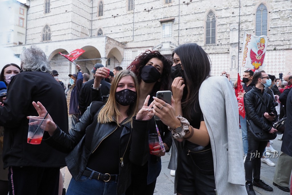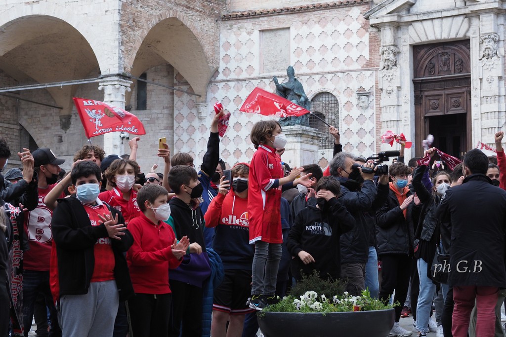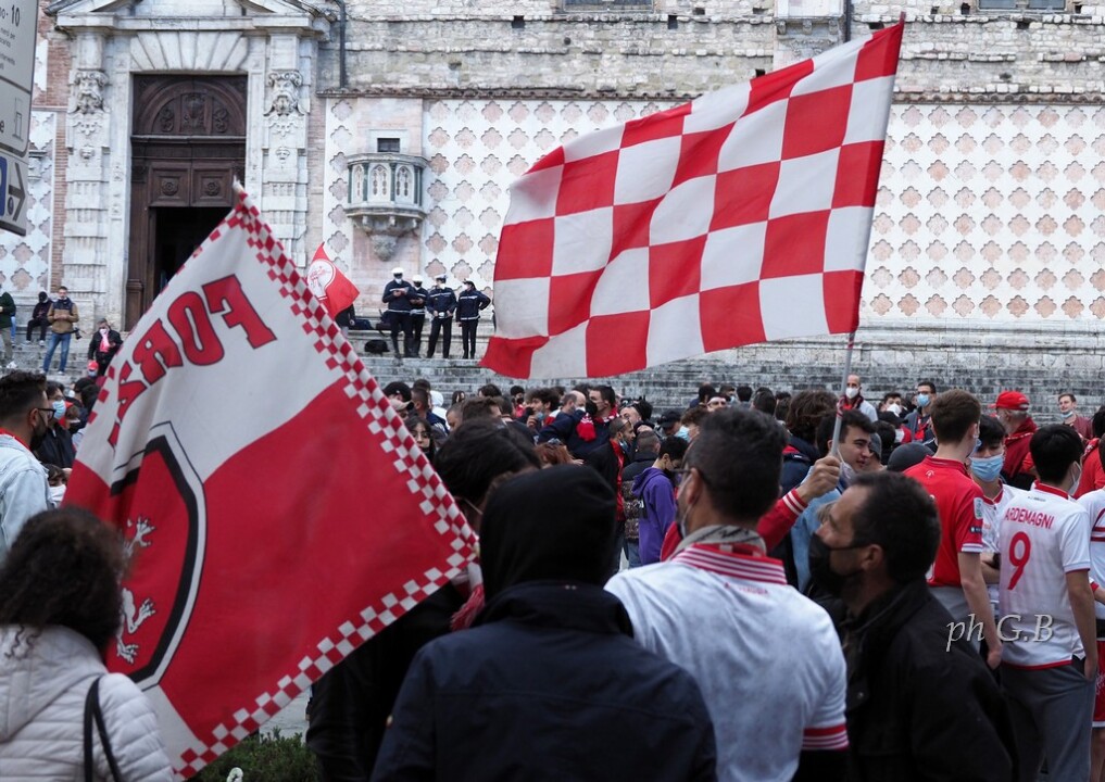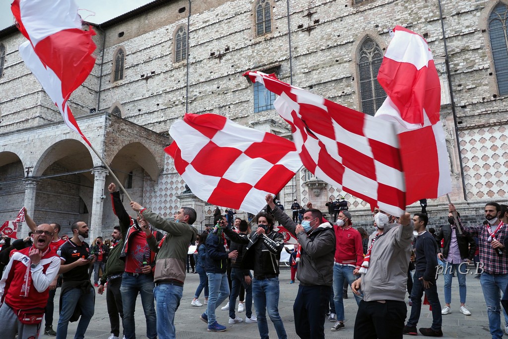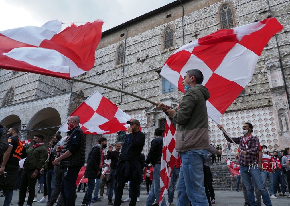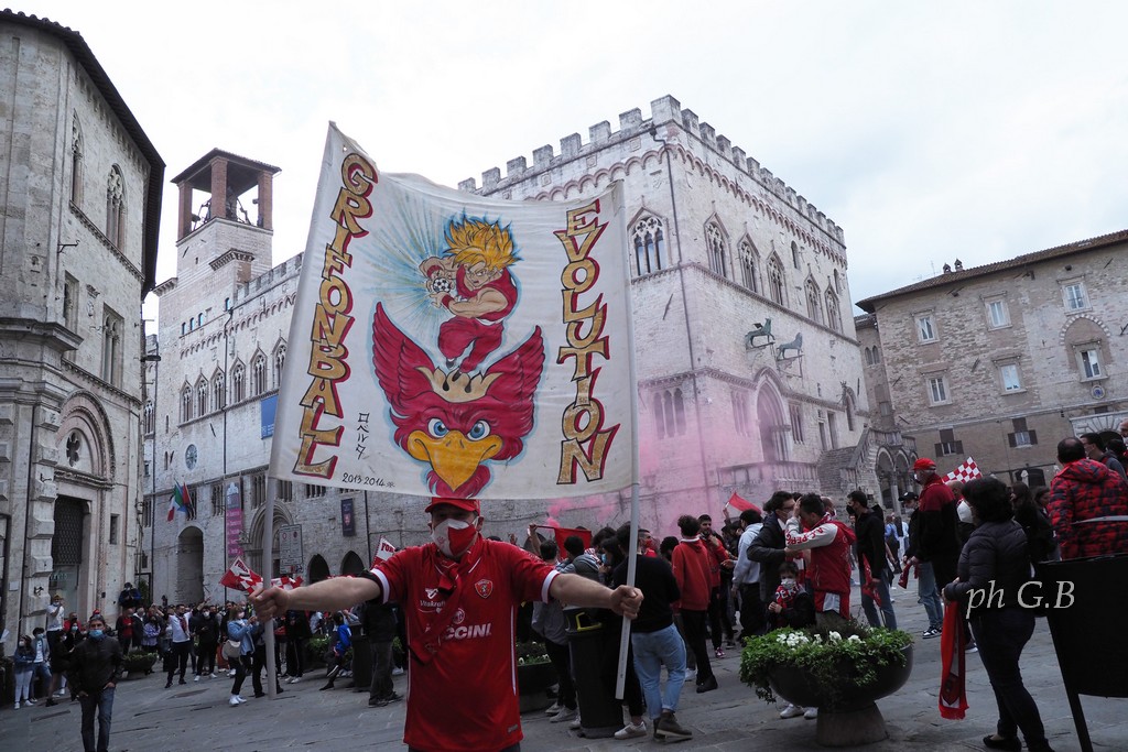 Un po’ di festa ci voleva! Se ne sentiva la mancanza! La vittoria del Perugia Calcio con la promozione in serie B, dopo un anno di assenza, ha fatto riversare tante persone in centro. Clacson di auto e moto, bandiere biancorosse, maglie, fumogeni, cori striscioni e salti di gioia in un centro che improvvisamente si è colorato di gioia e allegria. Un’ora dopo la fine della partita, con la promozione del Perugia grazie alla vittoria per 2-0 sul campo della FeralpiSalò, tantissimi tifosi biancorossi hanno raggiunto corso Vannucci e piazza IV Novembre. A centinaia nel cuore della città. Il centro, nonostante tutto è stato monitorato dalle forze dell’ordine per i provvedimenti anti-assembramento. Lungo le strade code di auto e clacson per festeggiare. Molti supporter del Perugia hanno raggiunto l’acropoli da Pian di Massiano, dove ci sono stati altri momenti di festa subito dopo la promozione.