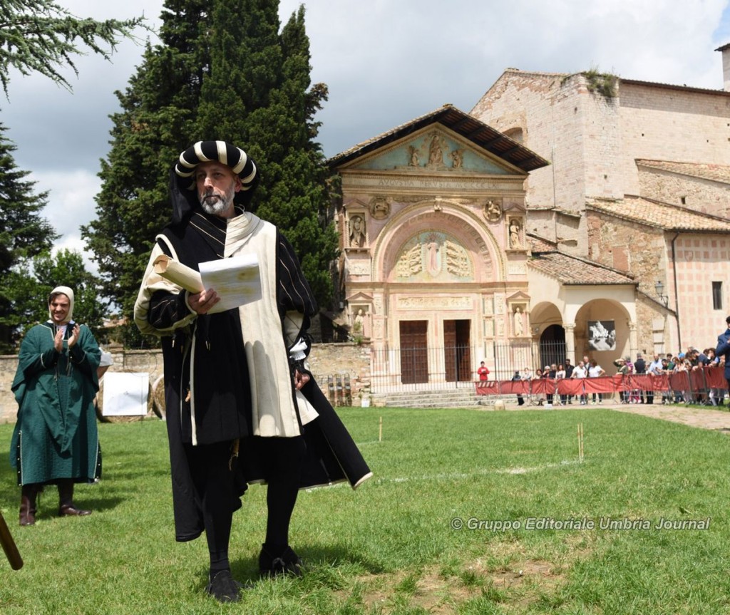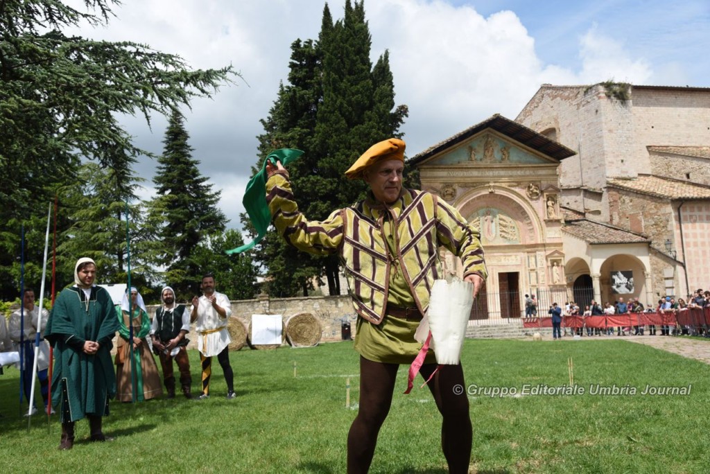 Prima della sfida, che consisteva nell’infilare un anello metallico, quindi, consecutivamente, colpire con il giavellotto il bersaglio vero e proprio, i cinque rioni cittadini si sono lanciati la sfida, in modo ironico a suon di sberleffi e promesse. Porta Eburnea, con il suo banditore Armando Flores Rodas, ha promesso di “mannà i vinti a consolà col vino”, prima di lanciare un fazzoletto portafortuna con i colori del Rione. Mirko Bigini banditore di Porta Santa Susanna ha annunciato che “il Rione di Porta Santa Susanna, che mai curva la schiena” avrebbe vinto la sfida “per far la porta ringagliardita”.