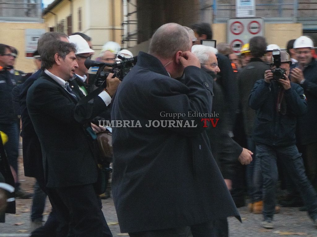 Al suo arrivo è stato accolto da un lungo applauso. Il presidente si è poi fermato parlare con i terremotati ascoltandoli e dando a ciascuno una sua parola di solidarietà. Enzo Bianconi a nome di tutti gli imprenditori gli ha poi consegnato una lettera. Mattarella prima di arrivare a Norcia ha visitato anche Camerino, un’altra città colpita dal terremoto. Presenti anche il commissario della ricostruzione, Vasco Errani, Fabrizio Curcio, capo Protezione Civile. Dopo è entrato nella zona rossa, accompagnato dai vigili del fuoco e dalle autorità. «Prometto impegno e lavoro fino alla fine, Norcia tornerà come prima, sarà lunga, ma ci vorrà tempo”. Queste le sue ultime parole prima di partire per il Trasimeno dove ha incontrato gli sfollati ospitati nelle strutture alberghiere.