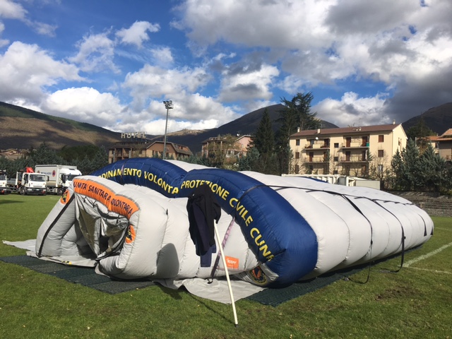 “Si tratta di un vero e proprio centro sanitario di base – evidenzia Barberini – in grado di ospitare servizi essenziali come triage, farmacia, nursery, ambulatori medici, pediatrici e per il supporto sociale e psicologico alla persone, in particolare alle categorie più fragili come anziani e bambini. Sono previsti anche spazi per il servizio veterinario e per uffici di servizio. La struttura, collocata nel campo sportivo davanti all’ospedale di Norcia, è composta – spiega – da tre speciali tende pneumatiche e moduli prefabbricati, per una superficie coperta totale di circa 1.500 metri quadrati.