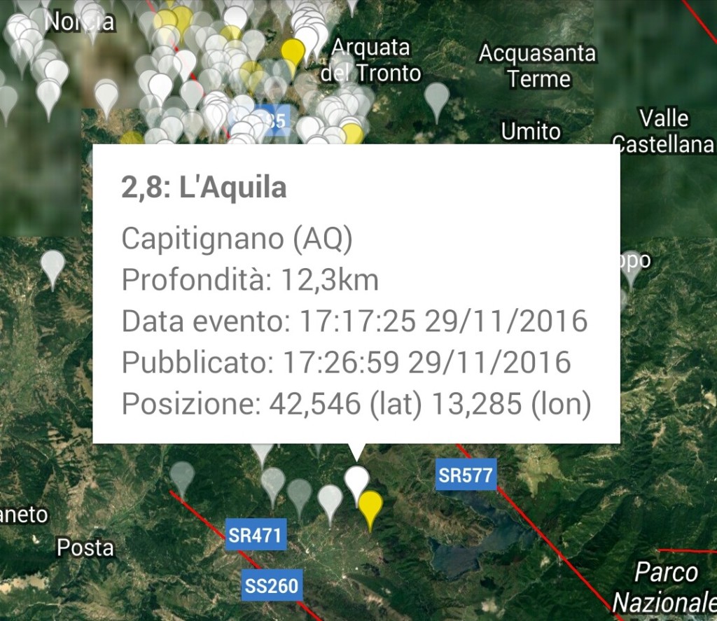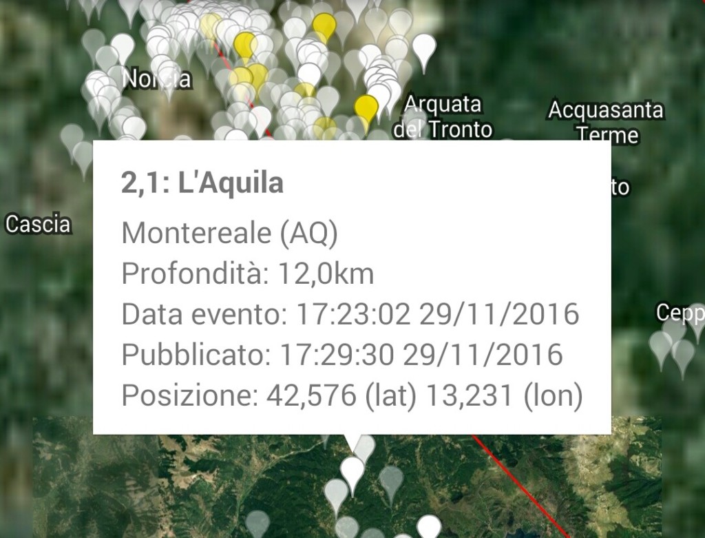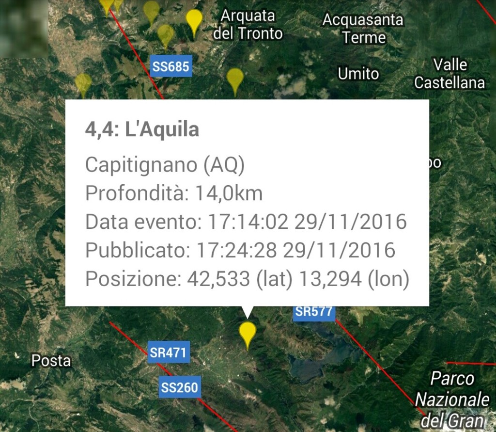 Trema la terra, forte scossa di magnitudo 4.4 avvertita anche in Umbria NORCIA – Non si ferma lo sciame sismico nel Centro Italia. Una scossa di terremoto di magnitudo 4.4 è stata registrata dall’Istituto Nazionale di Geofisica e Vulcanologia alle ore 17.14 del 29 novembre 2016. L’epicentro è a Capitignano in provincia de L’Aquila a una profondità di 14 chilometri con epicentro 22 km a nord ovest. I Comuni limitrofi sono Capitignano, Montereale, Campotosto, Barete e Cagnano Amiterno. La scossa è stata nettamente avvertita a L’Aquila città, ed inoltre, in altri comuni abruzzesi, delle Marche e ad Amatrice nel Lazio.