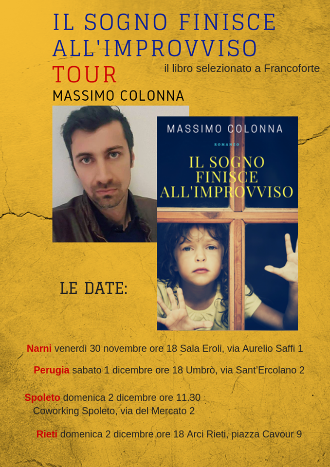 Un tour di quattro date tra l’Umbria e il Lazio, un contest dedicato a professionisti e il lancio di una nuova web community. Per celebrare il successo ottenuto con la selezione alla Fiera Internazionale del Libro di Francoforte, la casa editrice LetteraturaAlternativa di Romina Tondo lancia il tour del romanzo “Il sogno finisce all’improvviso”, scritto dal giornalista ternano Massimo Colonna. Tour organizzato in collaborazione con l’associazione culturale ‘Musicarte Adotta un artista’ di Sabrina Longari, con la partecipazione anche del responsabile editoriale dell’associazione, Riccardo Merlini, che ha curato l’editing del romanzo.