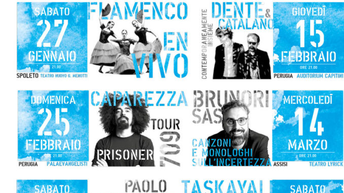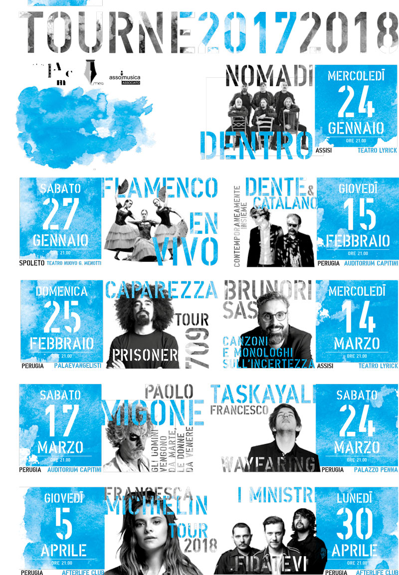 La nascita di Tourné segna un momento crescita e rinnovamento anche della propria rassegna 2018, che raccoglierà sotto il comune denominatore dell’autorialità gli spettacoli di musicisti, cantanti, comici e attori sempre originali e dall’impronta inconfondibile. A cominciare da nomi come Dente e Guido Catalano (15 febbraio), Caparezza (25 febbraio) e Brunori Sas (14 marzo) che inaugureranno questa nuova stagione. L’obiettivo di Tourné resta quello di rendere l’Umbria una tappa importante nei tour dei principali artisti nazionali ed internazionali, nonostante la carenza di spazi lamentata dagli addetti ai lavori. Di seguito le date già annunciate per Tourné, alle quali si aggiungeranno a breve nuove, importanti novità.