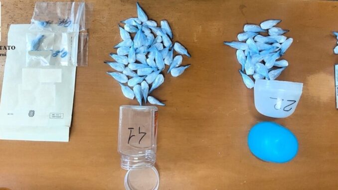 Questa volta è stato fermato: con sé aveva una cospicua somma di denaro e, in casa, sul comodino della camera da letto, gli agenti hanno trovato due barattoli in plastica contenenti 41 involucri, uguali a quelli appena sequestrati al giovane ternano, e un ovetto in plastica contenente altri 22 involucri, oltre ad un pacchetto di sigarette con dentro altri tre, per un totale di 50 grammi di cocaina.
