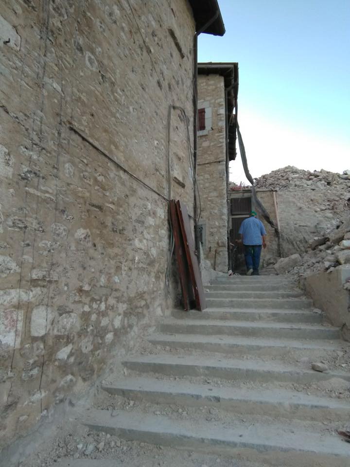 Il cuore a mille. Le gambe che tremavano nel percorrere una salita fatta miliardi di volte…tutto intorno solo cumuli di macerie. Una vista dall’alto del piano fiorito, stupenda, quasi dimenticata! Nessun punto di riferimento, nessuna scorciatoia, nessun volto conosciuto, nessun anziano sorridente che salutava dai portoncini, solo macerie. ”Insieme” in silenzio io e Amerigo,.abbiamo ritrovato le nostre scalette! In un mare di distruzione, quasi all’improvviso sono rispuntati i “nostri portoncini”…