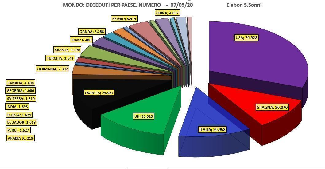 Ecco com’è al momento la situazione clinica dei contagiati a livello mondiale. Abbiamo una percentuale di circa il 5.8 per cento di deceduti e il 28,9 per cento di persone già guarite. La maggior parte, circa il 65,3 per cento sono in cura presso i vari nosocomi o presso i domicili a seconda dal gravità dei sintomi. L’Italia a livello mondiale dal secondo è scesa al terzo posto preceduta dagli Stati Uniti d’America e seguita dalla Spagna, dall’Inghilterra e Francia. La Cina, da dove ha avuto origine il Coronavirus, e dopo aver tenuto la vetta per diverso tempo, nella classifica mondiale è quasi sparita /grafiche di Salvatore Sonni.