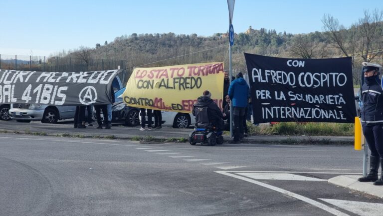C’era anche Lello Valitutti, l’anarchico in carrozzina, alla manifestazione solidale davanti al carcere di Capanne, in occasione dell’udienza di riesame per le misure cautelari dell’operazione Sibilla. Gli anarchici alle ore 8,30 si sono dati appuntamento lungo la strada regionale 220 Pievaiola per delle azioni di “solidarietà” nei confronti di Alfredo Cospito, militante anarchico insurrezionalista, che nel 2014 è stato condannato a 9 anni e 5 mesi di reclusione per la gambizzazione di Roberto Adinolfi, dirigente della Ansaldo Nucleare.
