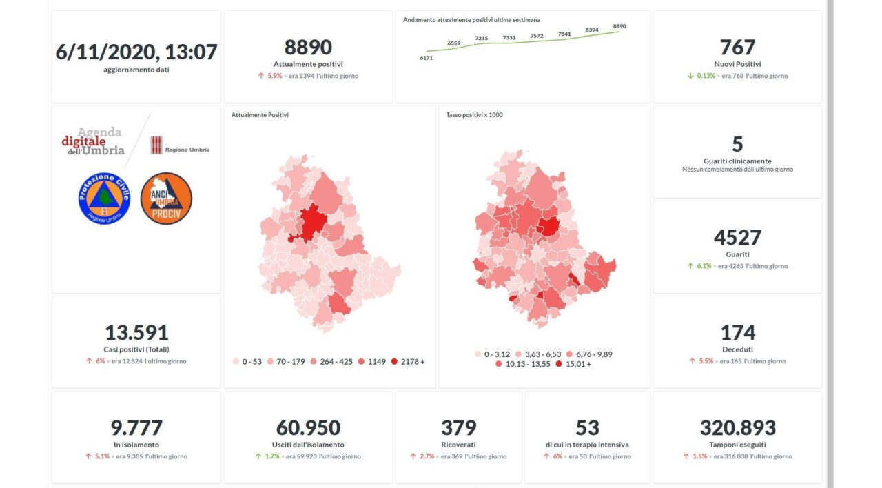 Il 5 novembre all’ospedale di Terni sono deceduti due uomini positivi al Covid: uno di 81 anni residente a Terni ed uno di 80 anni residente a Orvieto. Nella serata del 5 novembre è deceduto all’ospedale di Città di Castello un uomo di 80 anni positivo al Covid-10 residente a Perugia. Una donna di 72 anni è deceduta all’ospedale di Perugia, era residente a Bastia Umbra.
