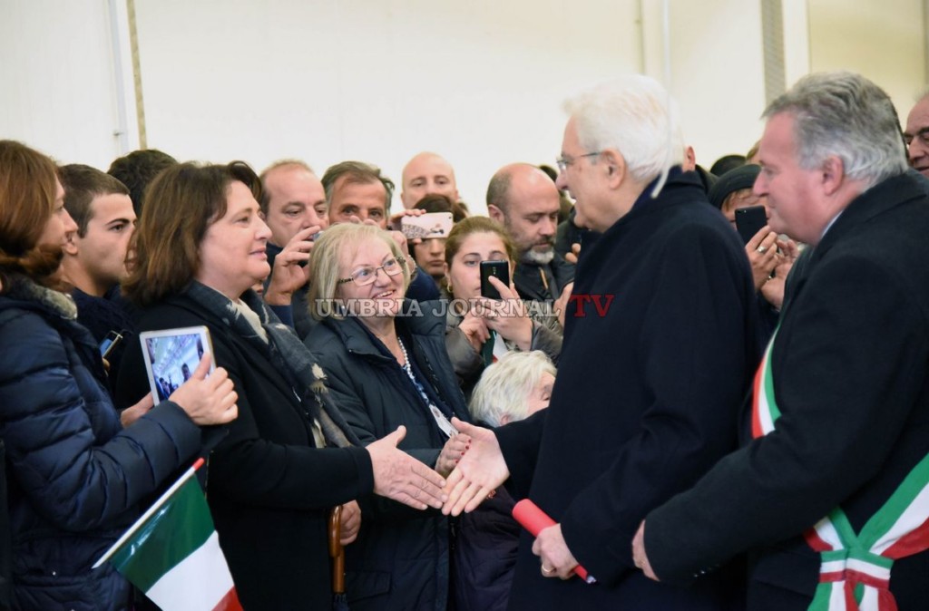 “Coraggio, ce la faremo” ha risposto così il Presidente a Francesca, ottantacinquenne di Preci, durante l’ incontro con la popolazione. “Ho detto al presidente – ha spiegato la signora Francesca – che sono scoraggiata, perché questa volta ci vorrà tanto a rimettere a posto le cose. Siamo distrutti – dice ancora – però Il presidente è riuscito a rassicurarmi”. Dopo aver visitato il prosciuttificio Salpi, dove ad accoglierlo erano preciani e nursini con bandierine tricolori , la visita del Presidente avrebbe previsto la tappa ad Amatrice. Visita saltata causa le avversità del tempo e l’impossibilità dell’elicottero presidenziale di decollare da Preci ed atterrare nella zona dei Monti della Laga causa la nebbia scesa sui Sibillini.