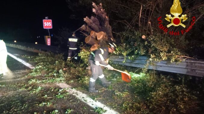 Il vento ha causato la caduta di numerose piante, con conseguenze rilevanti sulla viabilità e sulla sicurezza. L’intervento più critico si è verificato lungo il tratto sud dell’autostrada A1, poco prima dello svincolo per Attigliano, dove un albero di grandi dimensioni è precipitato sulla carreggiata, ostruendo completamente il traffico in direzione sud.