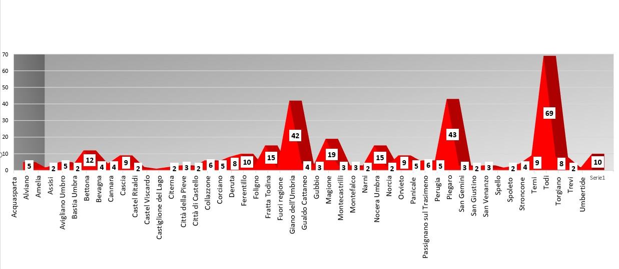 Due sono i guariti uno a Corciano e uno da fuori regione. I nuovi casi vengono registrati a Cannara (+1) che porta il totale a 9, a Collazzone (+1) che porta il totale a 5, Gualdo Cattaneo che da 2 sale a 3 e un nuovo caso a Passignano sul Trasimeno che sale a 1.