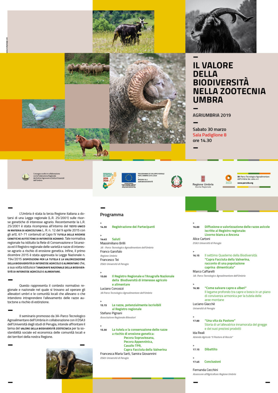E’ facendo leva su questi presupposti che il Parco Tecnologico Agroalimentare dell’Umbria – 3A-PTA partecipa alla 51esima edizione di “Agriumbria” (29 – 31 marzo 2019 /Bastia Umbria) – la mostra nazionale dell’agricoltura, zootecnia e alimentazione che da oltre mezzo secolo rappresenta l’agricoltura italiana di qualità – e lo fa raccontando la propria esperienza, dando spazio anche alle aziende agricole ed alle loro esperienze, nell’incontro dal titolo “ll valore della biodiversità nella zootecnia umbra” che si terrà sabato 30 marzo alle ore 14.30 presso la sala del Padiglione 8 – Umbriafiere, Bastia Umbra (Pg).