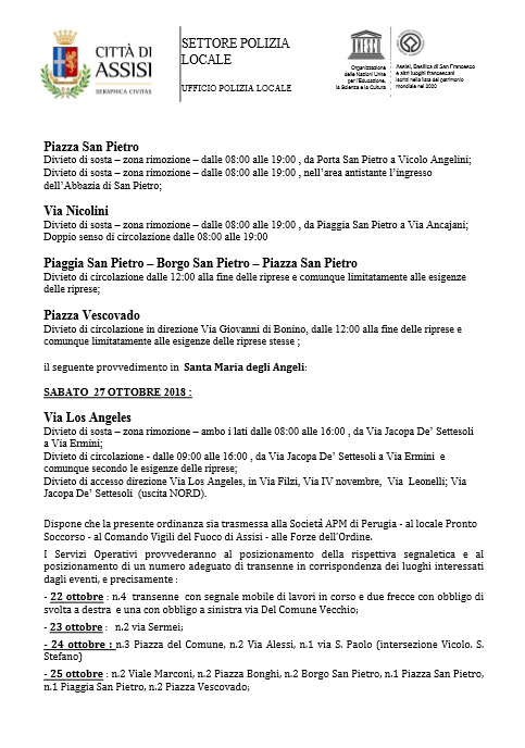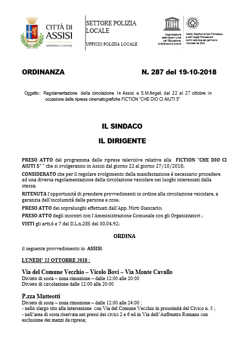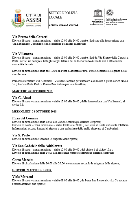 Oltre agli attori, decine di persone tra troupe e tecnici. Per facilitare le riprese e i movimenti degli addetti ai lavori e dei loro mezzi, si renderanno necessarie alcune modifiche alla normale circolazione stradale che sono riportate nell’ordinanza n. 287 del 19-10-2018 (in allegato).