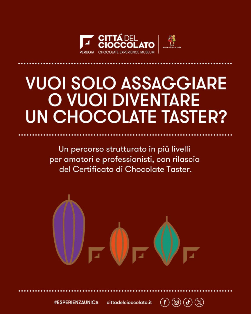 Parallelamente alle attività culturali, la struttura punta con decisione sulla didattica specialistica per formare i nuovi esperti del settore. Nei giorni del 9 e 10 maggio 2026, presso i locali del LAB in via Angusta, si terrà il corso di primo livello per Chocolate Taster. Il percorso formativo, rivolto sia a professionisti che a semplici appassionati, sarà guidato da Roberto Caraceni, Direttore didattico della Città del Cioccolato ed esperto di analisi sensoriale. Durante le lezioni, i partecipanti impareranno a distinguere le diverse varietà di cacao e a comprendere come la coltivazione e la lavorazione influenzino il profilo aromatico di una tavoletta. Al termine delle due giornate, verrà rilasciato un certificato ufficiale che abilita alle tecniche base di degustazione tecnica del cioccolato. Pertanto, l’apprendimento teorico si sposerà con analisi sensoriali dettagliate, rendendo i partecipanti veri esperti delle sfumature organolettiche del prodotto. Un’esperienza che forma e risponde alle tante curiosità dei chocolate lovers, per informazioni e iscrizioni: r.caraceni@cittadelcioccolato.