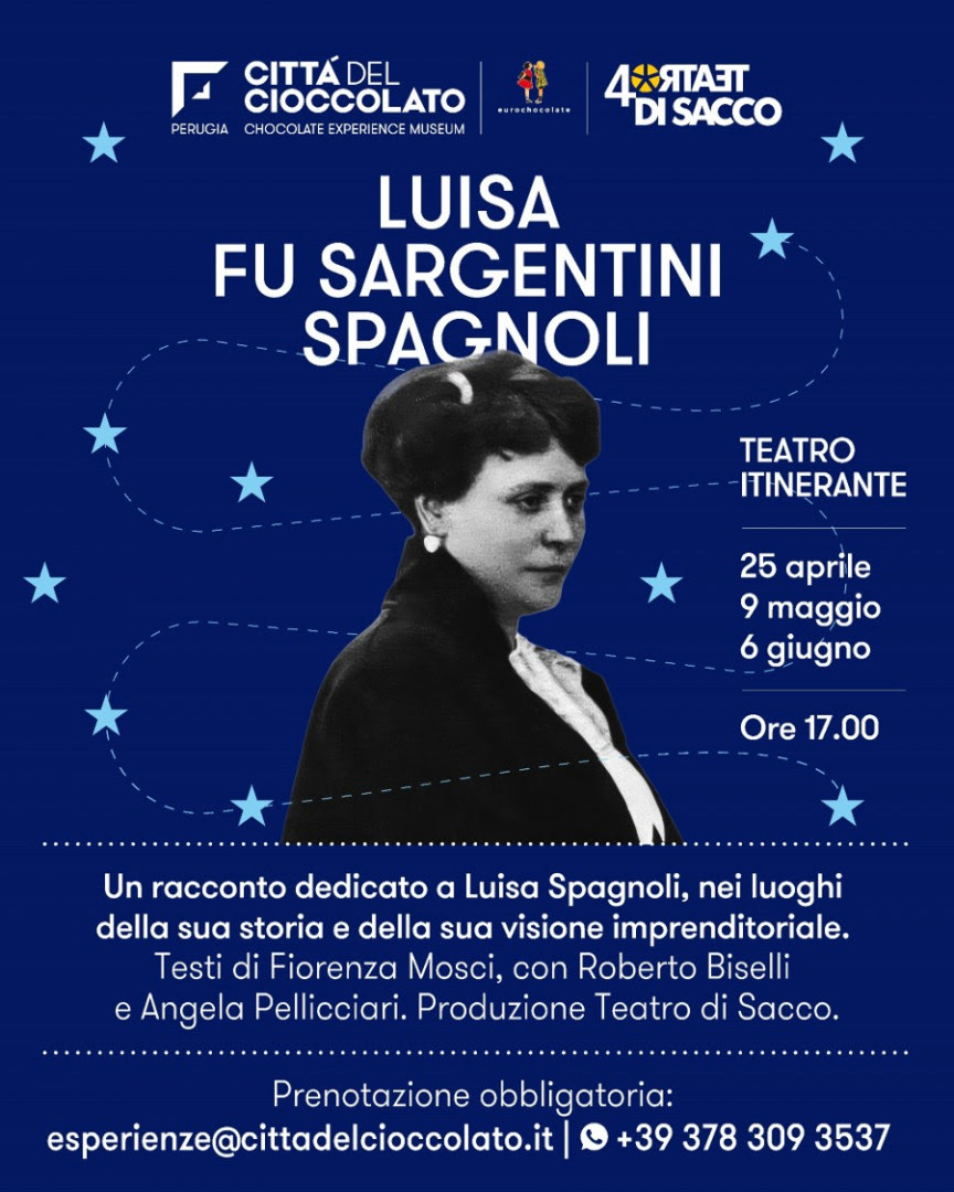 Sabato 25 aprile 2026 prenderà il via il racconto itinerante “Luisa fu Sargentini Spagnoli”, un progetto realizzato in sinergia con il Teatro di Sacco. Questa drammaturgia itinerante permetterà ai partecipanti di ripercorrere le tappe fondamentali della vita della fondatrice della Perugina direttamente tra i vicoli del centro storico. Il percorso partirà da via Alessi, sede del laboratorio originario, per concludersi in corso Cavour presso la Sala Cutu, dove gli attori Roberto Biselli e Angela Pellicciari daranno voce ai testi di Fiorenza Mosci. Il tour, che prevede repliche anche a maggio e giugno, rappresenta un’occasione unica per scoprire i legami profondi tra l’identità cittadina e l’industria del cioccolato, celebrando il genio di una donna che ha rivoluzionato il costume e l’economia nazionale. Di conseguenza, il pubblico non sarà solo spettatore, ma parte integrante di un viaggio nella memoria collettiva umbra. Le repliche nei pomeriggi di sabato 9 maggio e sabato 6 giugno. Per informazioni e prenotazioni è possibile scrivere a esperienze@cittadelcioccolato.
