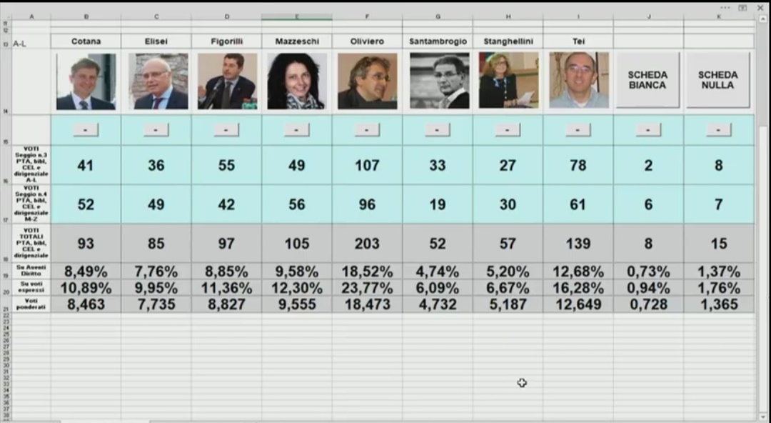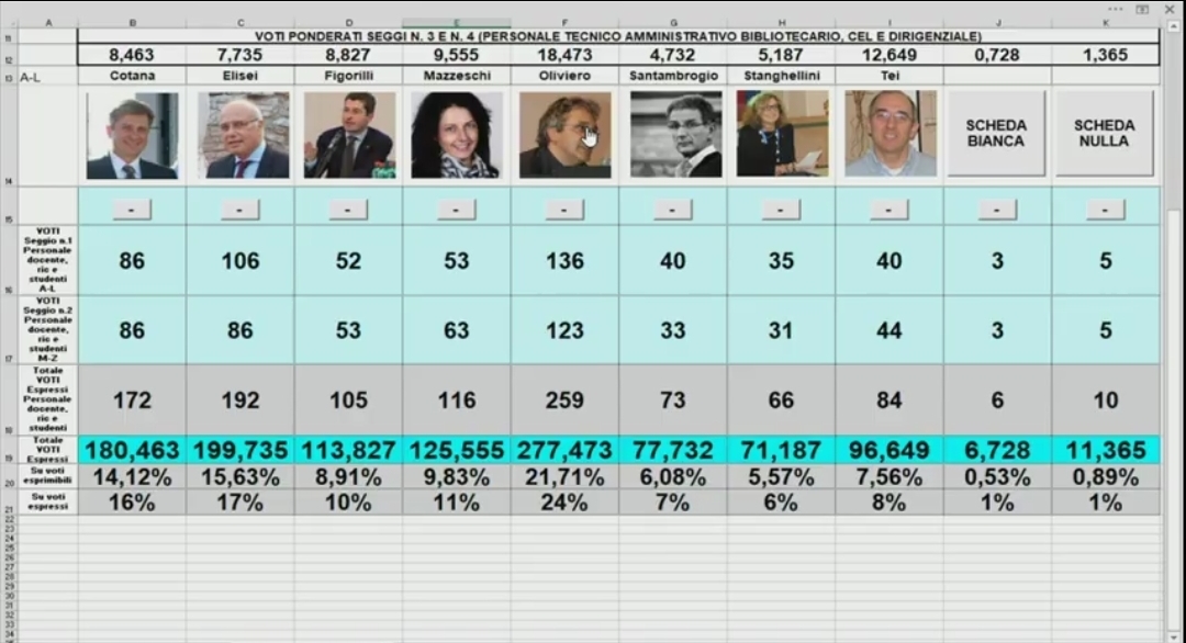* I voti espressi dal personale di ruolo Tecnico Amministrativo, Bibliotecario, CEL e Dirigenziale sono computati nella misura del dieci per cento in riferimento al numero dei professori ordinari, associati, dei ricercatori a tempo indeterminato e a tempo determinato, secondo quanto previsto dall’articolo 31 del Regolamento Generale d’Ateneo.