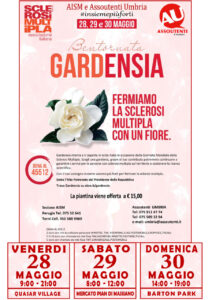 I volontari di Assoutenti saranno presenti venerdì 28 maggio, dalle ore 9 alle 21, al Quasar Village (zona casse Conad), sabato 29 maggio, dalle 8 alle 12, all’interno del mercato di Pian di Massiano (lato stadio Renato Curi), e domenica 30 maggio, dalle 14 alle 19, all’interno del Barton Park. Acquistare una gardenia vuol dire fare una donazione di 15 euro, un piccolo gesto per un mondo libero dalla sclerosi multipla che sta a significare che #insiemepiuforti.