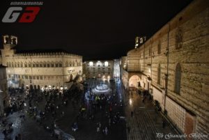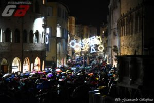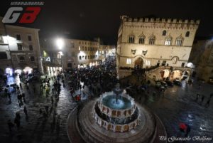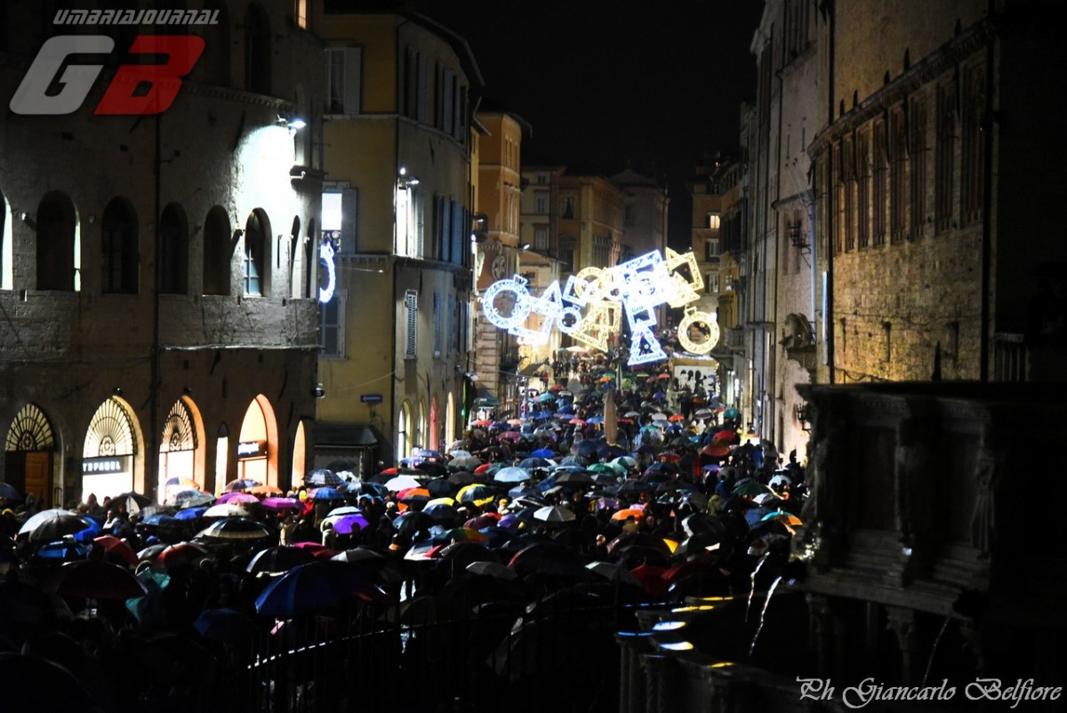 A causa del meteo -pioggia e forti raffiche di vento- non si è potuta tenere la suggestiva “camminata” del funambolo Andrea Loreni sopra Piazza IV Novembre, che avrebbe dovuto accendere il primo “assaggio” della nuova illuminazione. In ogni caso, puntualmente, gli 82 nuovi punti luce installati in Piazza IV Novembre sono stati accesi a valorizzare, con una illuminazione diffusa, la Fontana Maggiore, la Cattedrale di San Lorenzo (in particolare le facciate su piazza IV Novembre e piazza Danti e il campanile di S. Lorenzo), Palazzo dei Priori con un accento luminoso della facciata su Piazza IV Novembre, le statue del Grifo e del Leone e il prospetto frontale su corso Vannucci; nuova luce anche per le statue dei S.S. Patroni collocate sopra al portale e le logge di Palazzo dei Priori e di Fortebraccio con accento luminoso alla Pietra della Giustizia. Altri 26 punti luce perimetrali esistenti sono stati riqualificati.