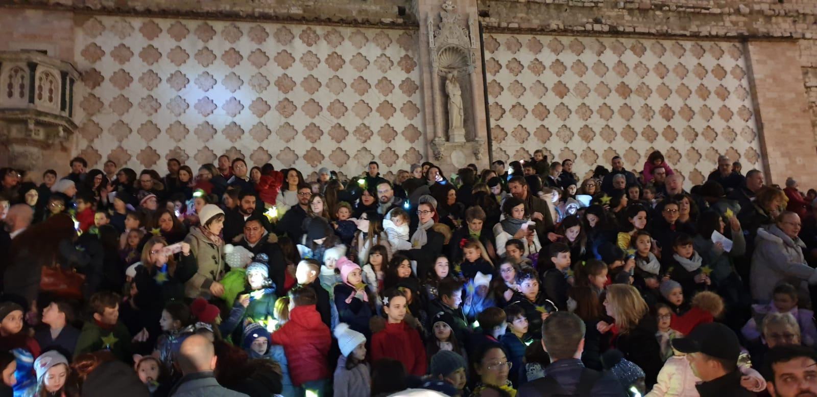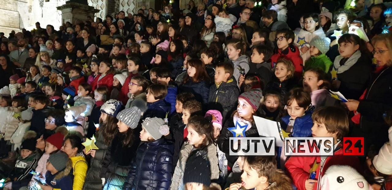 L’emozione si è fatta forte quando ha preso il via il “ping-pong” – come lo ha definito lo speaker della serata, Marco Cruciani- tra la fanfara e i bambini che si sono alternati, tra musica e canti, permettendo a tutto il pubblico presente di immergersi nell’atmosfera natalizia, complici le luci e gli addobbi della piazza e del vicino Corso Vannucci vestito a festa.