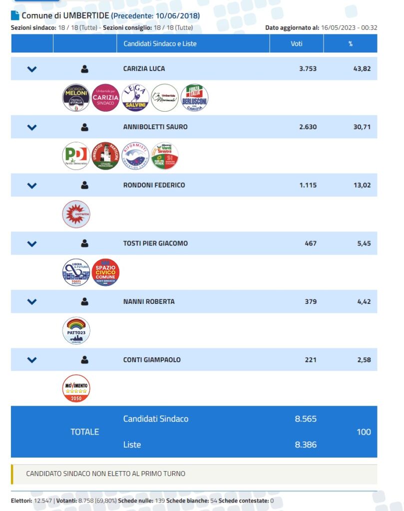 Ballottaggio sarà anche a Umbertide tra il sindaco uscente Luca Carizia e Sauro Anniboletti. Carizia ha ottenuto il 43,82% e Anniboletti al 30,71%.
