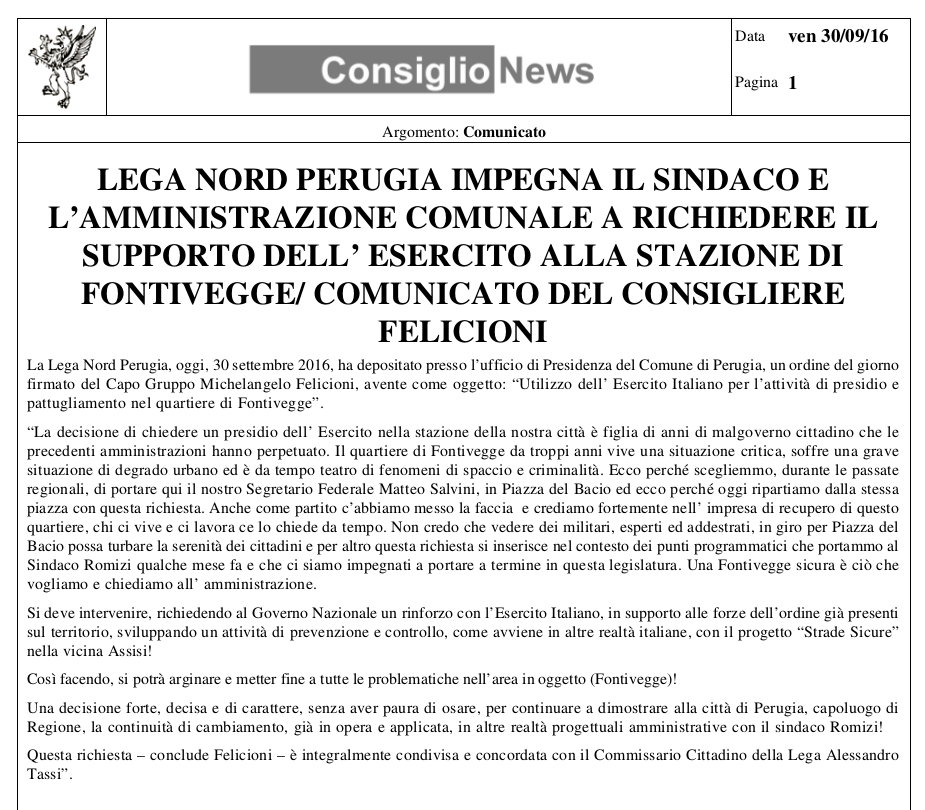 La Lega Nord e Fontivegge Perugia, l’esercito? Ma… da Giampiero Tamburi PERUGIA – L’Esercito per Fontivegge… … come per Bosnia Erzegovina, Iraq, Libano, Kosovo, Afganistan, Somalia, Libia; tanto per citare le più recenti e conosciute! Presentando l’ordine del giorno che chiede di utilizzare l’Esercito come presidio e pattugliamento, per il quartiere di Perugia, il capogruppo del partito che rappresenta in Comune la Lega Nord, si assume, nei confronti della città, naturalmente se dovesse essere messo in atto un tale provvedimento (cosa che non credo assolutamente), una responsabilità non indifferente, sia di ordine morale, politica che civile.