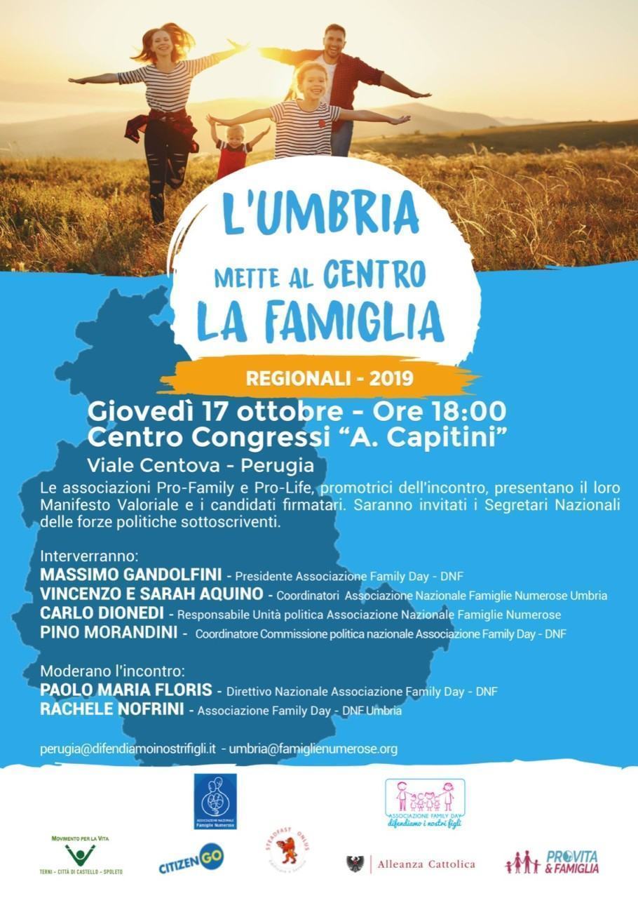 Giovedì 17 Ottobre, alle 18.00, presso il Centro Congressi “A.Capitini”, le sette associazioni firmatarie del Manifesto Valoriale per l’Umbria danno appuntamento a tutta la cittadinanza e ai candidati a Presidente della Regione Umbria e al Consiglio Regionale per un incontro pubblico di presentazione del Manifestato valoriale per la vita, la famiglia e la libertà educativa. Hanno confermato la loro presenza il presidente di Fratelli d’Italia, Giorgia Meloni, del segretario della Lega, Matteo Salvini e del presidente di Forza Italia, Silvio Berluconi.