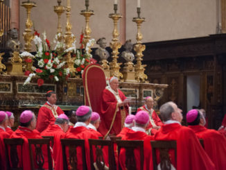 PERUGIA – Anche quest’anno è stata particolarmente partecipata la Messa Crismale nella cattedrale di San Lorenzo in Perugia, Mercoledì Santo 12 aprile, presieduta dal cardinale Gualtiero Bassetti insieme all’emerito mons. Giuseppe Chiaretti, al vescovo ausiliare mons. Paolo Giulietti e all’abate benedettino Giustino Farnedi. E’ una celebrazione che vede sempre centinaia di fedeli e le famiglie dei ragazzi che nel corso dell’anno ricevono il sacramento della Cresima, provenienti anche dalle parrocchie di periferia. Apertasi con la tradizionale processione di sacerdoti diocesani e religiosi, diaconi e seminaristi – percorrendo piazza IV Novembre accanto alla splendida duecentesca Fontana Maggiore per poi far ingresso in cattedrale -, questa celebrazione rappresenta il segno tangibile di unità dell’intera comunità ecclesiale attorno al suo Pastore nel giorno in cui i sacerdoti rinnovano la loro promessa formulata nel momento dell’ordinazione presbiterale e culmina con la consacrazione degli oli santi.