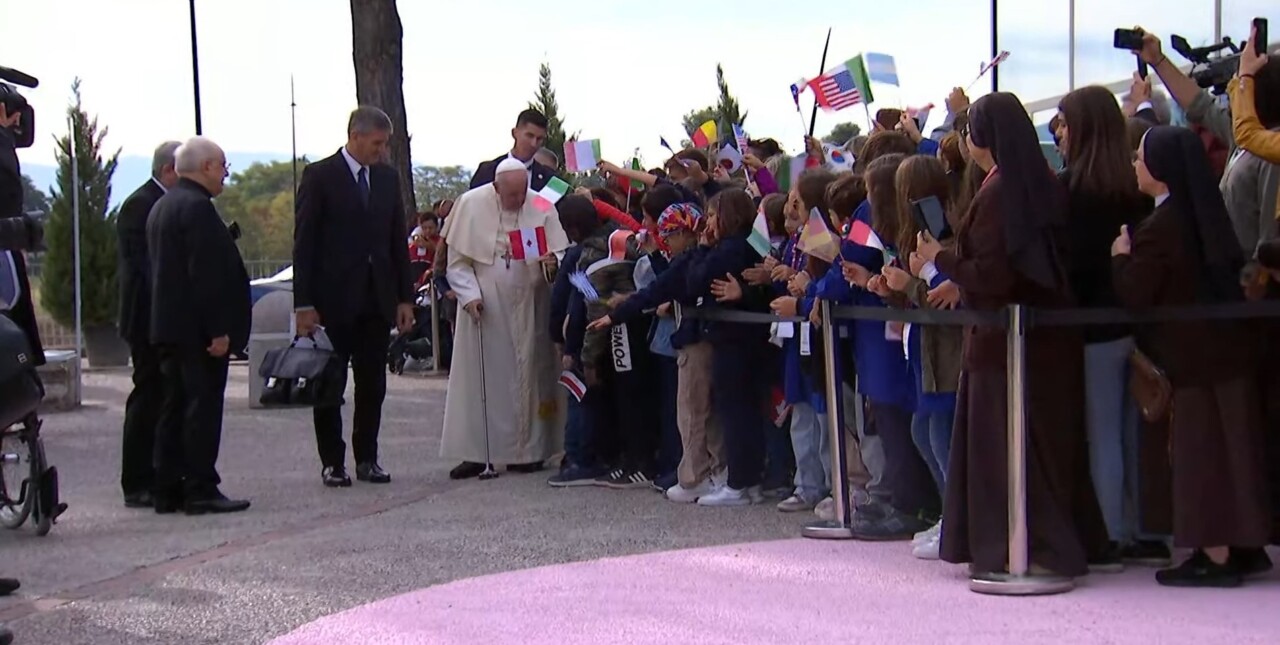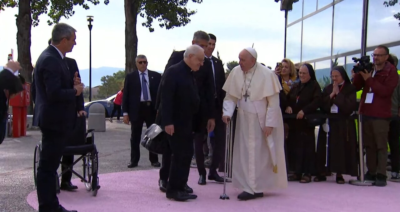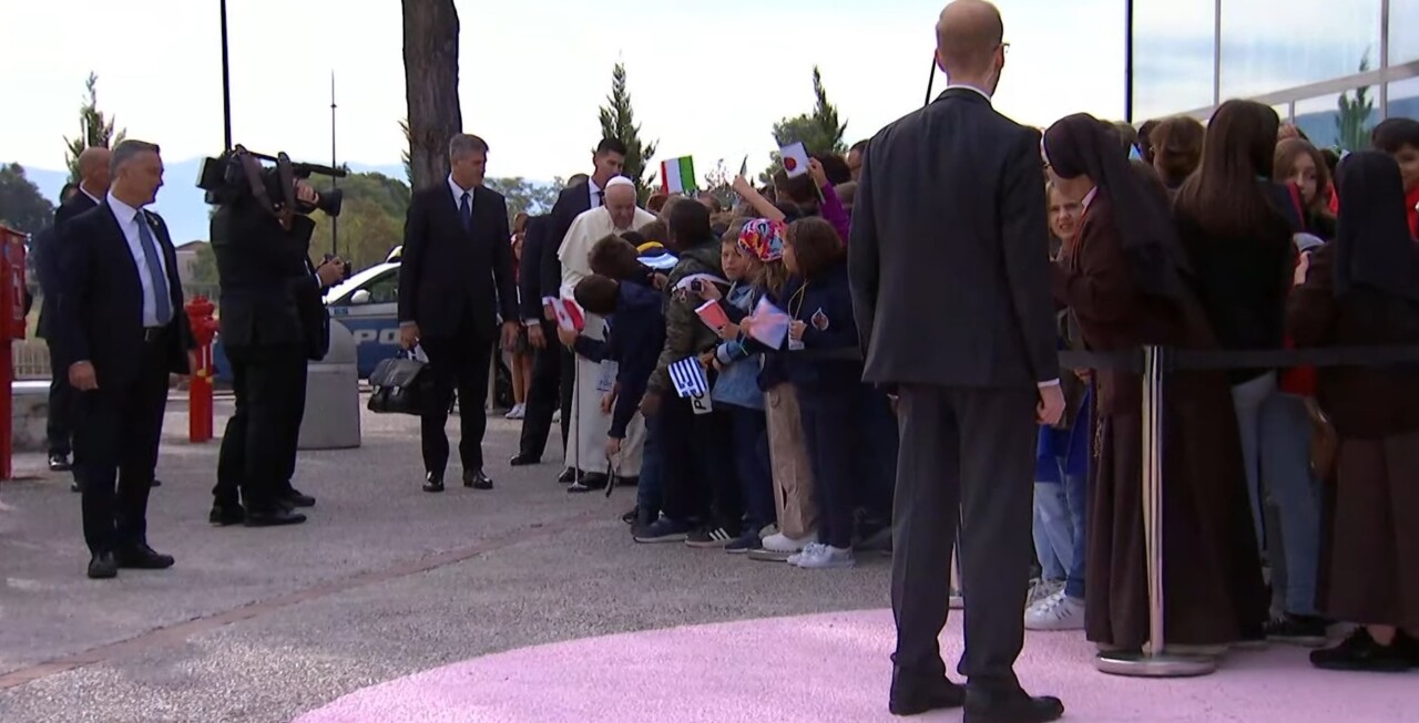 Il Papa è arrivato ad Assisi per incontrare i mille delegati di “Economy of Francesco”, arrivati da tutto il mondo. Partito alle 9 dall’eliporto vaticano, al suo arrivo nel Piazzale antistante il Pala-Eventi di Santa Maria degli Angeli viene accolto presso il Teatro Lyrick da tre giovani, in rappresentanza dei partecipanti all’evento; dal Prefetto del Dicastero per il Servizio dello Sviluppo Umano Integrale, il card. Michael Czerny; dall’arcivescovo-vescovo di Assisi-Nocera Umbra-Gualdo Tadino e di Foligno, mons. Domenico Sorrentino; da Donatella Tesei, presidente della Regione Umbria, dal Prefetto di Perugia, Armando Gradone; da Stefania Proietti, sindaco di Assisi e presidente della Provincia di Perugia; dai membri del Comitato Promotore dell’Evento, Luigino Bruni; Francesca di Maolo e suor Alessandra Smerilli, e da rappresentanti delle Famiglie Francescane di Assisi e della Pro Civitate Christiana.