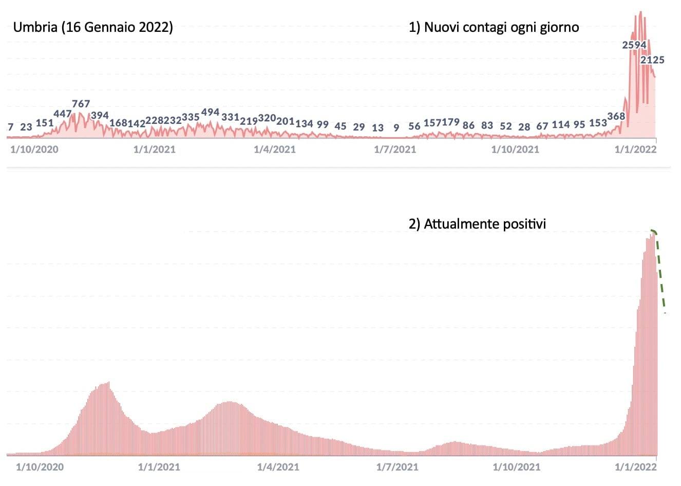 “La curva 1) – dice – rappresenta il numero di nuovi casi giorno per giorno. Si osserva una significativa diminuzione con la formazione un massimo chiaro e consolidato. Questo è il primo e importante segno che si cerca quando si analizzano le curve epidemiche”. La curva 2) rappresenta il numero degli attuali positivi. Come si vede, aiutando l’occhio con la curva verde tratteggiata, questa curva sembrerebbe aver raggiunto un massimo. Siamo comunque in presenza di grandi fluttuazioni ed il fenomeno di cui ci occupiamo è di tipo probabilistico, per cui va mantenuta sempre una prudenza nell’analizzare i dati. Il massimo di questa curva, se consolidato, è un ulteriore segnale confortante che la fase peggiore di questa quinta ondata è passata in Umbria, con qualche anticipo sull’andamento medio dell’Italia”.