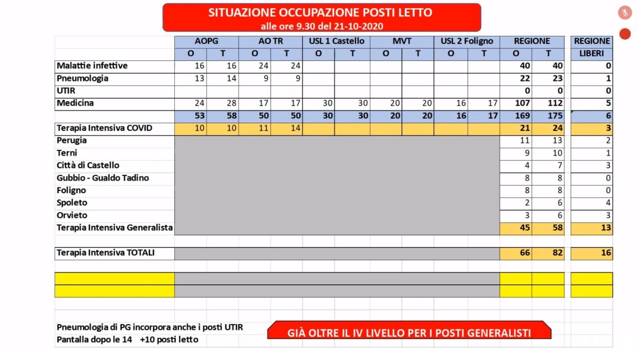 Alla conferenza stampa hanno partecipato l’assessore alla sanità, Luca Coletto, e il direttore Claudio Dario. L’assessore ha detto che “In Umbria l’rt ha raggiunto 1,69. In 16 giorni si è passati da 48 posti letto occupati a 170, mentre per la Terapia intensiva nello stesso periodo è passata da 6 a 20 pazienti. L’incremento più imponente è quello relativo agli isolamento domiciliare”.