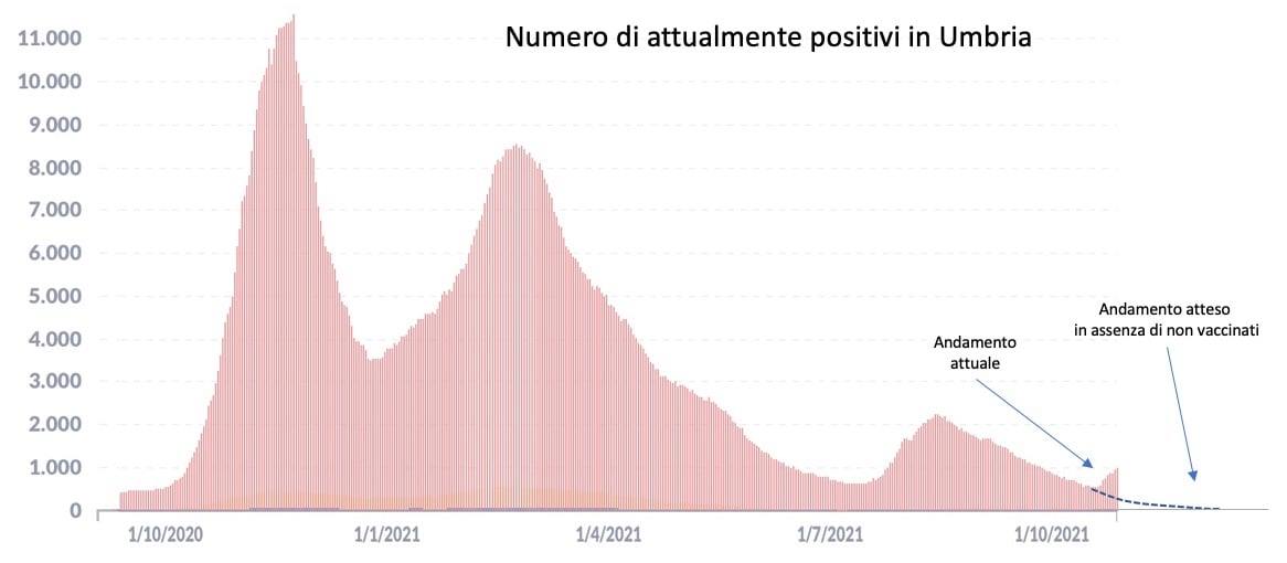 Perché? Per rispondere a questa domanda dobbiamo analizzare chi sono i nuovi contagiati che alimentano la curva. Dai dati della Regione Umbria emerge che c’è una significativa frazione di non vaccinati che mostrano una probabilità di infettarsi che è circa 4.5 volte quella delle persone vaccinate con doppia dose.
