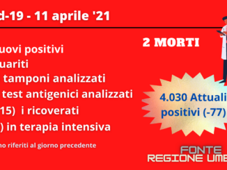 Quasi 100 attuali positivi al covid in meno rispetto a giovedì, 97 con l’esattezza. Emerge dai dati sul sito della Regione alla data del 21 maggio. Gli attualmente positivi sono ora 2.097. Tra giovedì e venerdì sono stati registrati 45 nuovi postivi, 139 guariti e tre morti. Scendono ancora i ricoverati Covid negli ospedali dell’Umbria, ora 101, dieci meno del giorno precedente, 12 dei quali, tre in meno, nelle terapie intensive. Sono stati analizzati 2.202 tamponi e 3.768 test antigenici. Il tasso di positività è dello 0,75 per cento (0,76 il giorno precedente) e del 2 per cento sui soli molecolari (era 1,9).