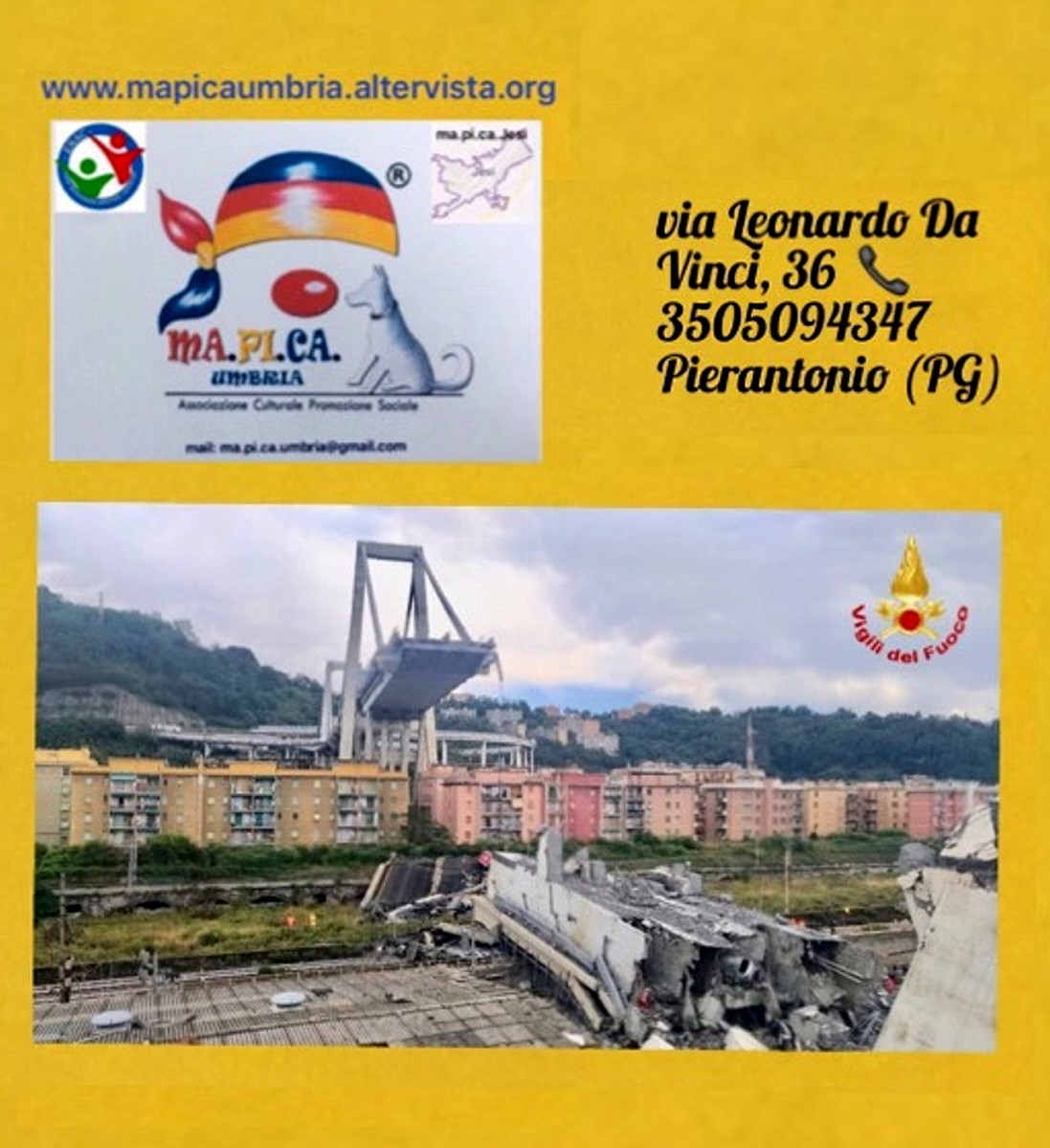 Crollo ponte Morandi, Mapica Umbria mette a disposizione ufficio legale L’associazione Mapica Umbria (affiliata ENAC Ente Nazione Attività Culturali), in seguito alla tragedia che ha colpito la città di Genova, per il crollo del ponte Morandi, si è riunita con il presidente Giuseppe Castelli, il presidente Roberto Pierotti, il segretario iniziativa Pasquale Marsico, il delegato provinciale di Jesi Mario Fabbi e il legale dell’associazione ma.pi.ca.umbria. Esprimono tutta la solidarietà alle famiglie delle vittime. Al termine della seduta straordinaria l’associazione culturale di promozione sociale ma.pi.ca.umbria è Jesi mettono gratuitamente il proprio ufficio legale a disposizione delle famiglie delle vittime del ponte Morandi. Rivolgersi a: associazione culturale di promozione sociale ma.pi.ca.umbria via Leonardo da Vinci 36 Pierantonio (PG) telefono 350 50 94 347 e mail ma.pi.ca.unbria@gmail.com sito Internet www.mapicaumbria.altervista.org