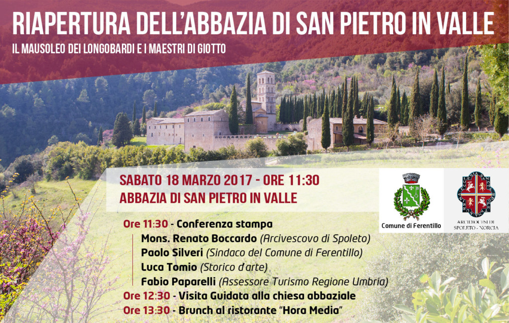 FERENTILLO – Riapre al pubblico la Chiesa abbaziale di San Pietro in Valle a Ferentillo, uno dei monumenti artistici più significativi dell’Umbria, al confine tra i territori di Terni e di Spoleto. All’evento della riapertura ufficiale presenzieranno l’Arcivescovo di Spoleto, S.E. Mons. Renato Boccardo, il Sindaco del Comune di Ferentillo, Paolo Silveri, l’Assessore al Turismo e Vicepresidente della Regione Umbria, Fabio Paparelli, e lo storico dell’arte Luca Tomio.